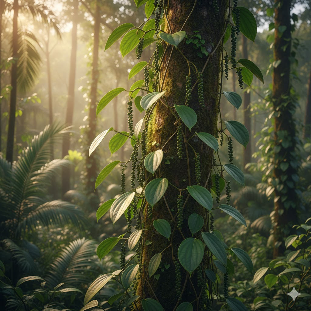The story begins in the humid, monsoon-drenched hills of the Malabar Coast in Kerala, India. Here, amidst the lush greenery, vines climb high up the tropical trees, bearing clusters of small, green berries.